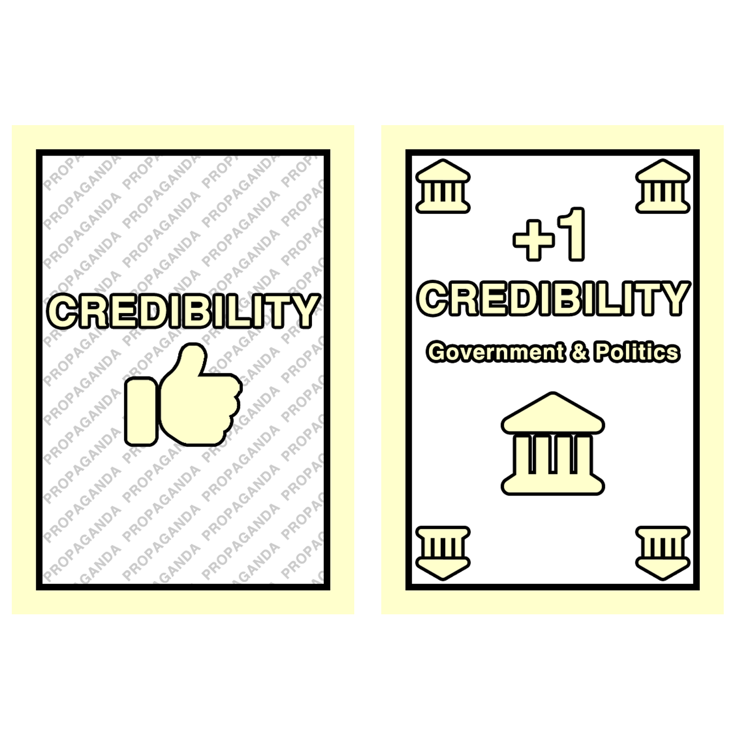 Credibility Cards are the foundation of power in PROPAGANDA. Representing influence across ten real-world sectors, they function as both currency and leverage — funding your operations while shaping the balance of power on the board.
