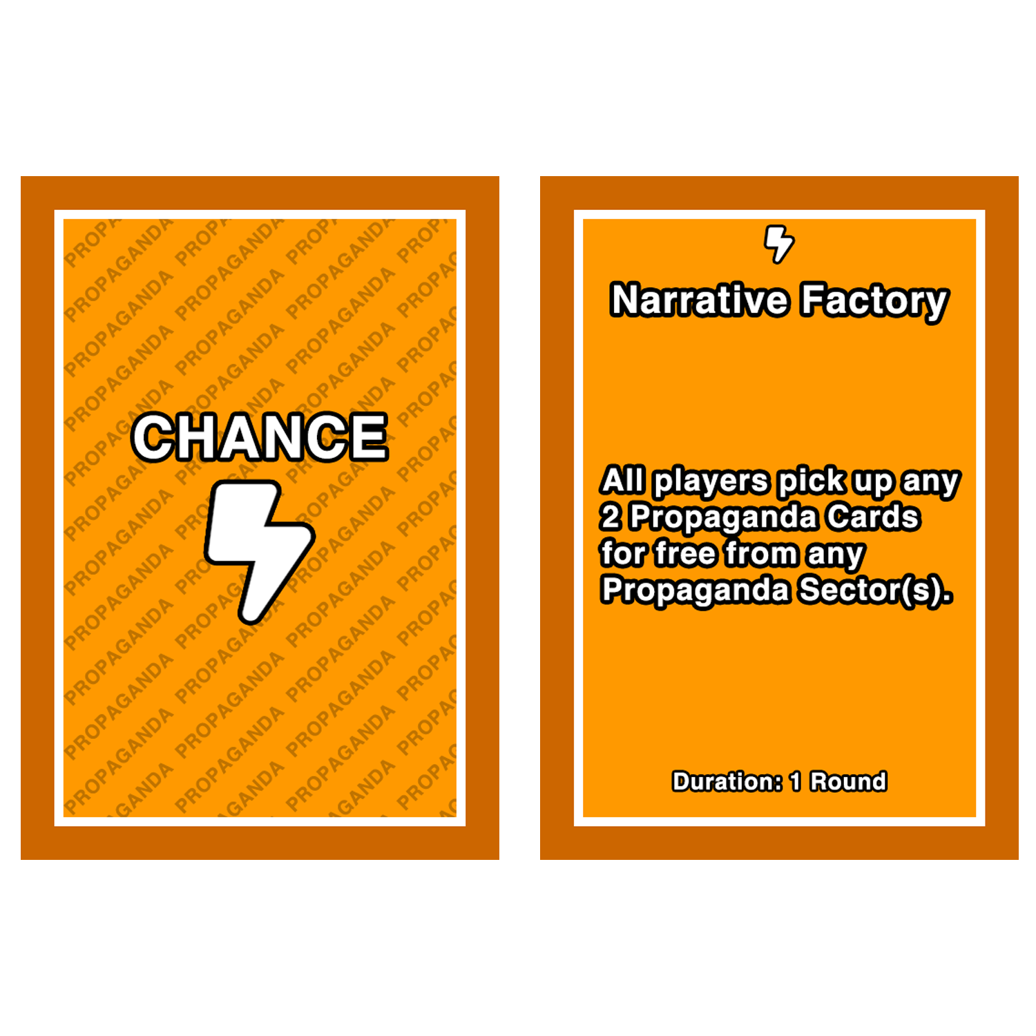 Chance Cards introduce global events that affect all players and redefine what actions are possible in any given round. From investigations that temporarily shut down entire propaganda sectors to shifting conditions that alter strategy, these cards ensure no game unfolds the same way twice.