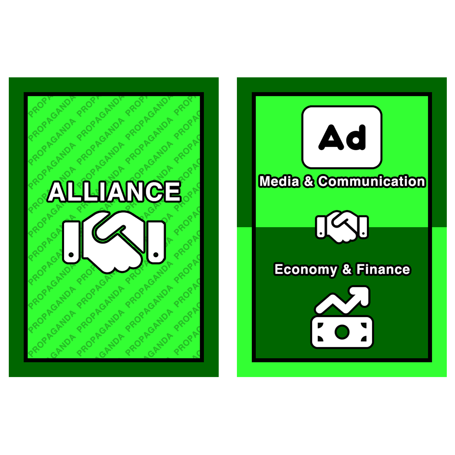 Alliance Cards allow players to formally link two propaganda sectors, unlocking powerful efficiencies in movement, collection, and attacks. By coordinating influence across sectors, players can accelerate growth, expand their reach, and execute strategies that would otherwise take multiple turns.